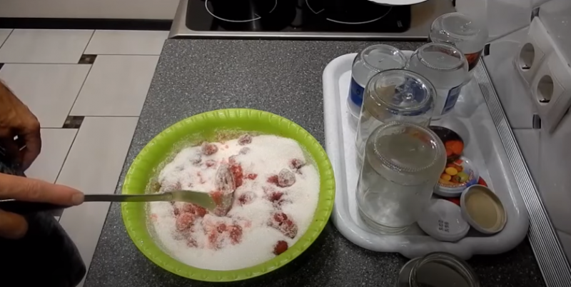 - Итак, ягоду сполоснули, переложили в тарелку и засыпаем сахаром. После чего оставьте всё в таком состоянии на 2-3 часа. При комнатной температуре, чтобы она дала сок. Не перемешивайте.